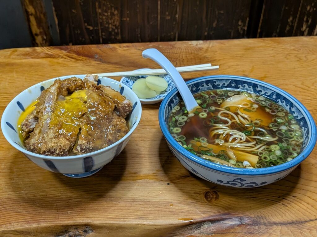 少ししょっぱい「しなそば」と「かつ丼」のセットが有名なお店.店内は少し狭いが,味はとてもおいしい.